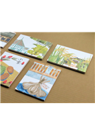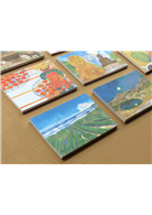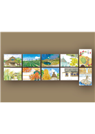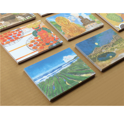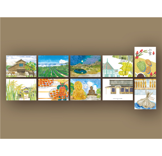 十個台灣鄉鎮景點明信片,有地質景觀、特產與文化景觀。依序是:新北石門老梅綠石槽、新竹縣新埔柿餅、台中后里馬場、南投集集的集集車站、高雄旗山香蕉、彰化大佛、雲林莿桐蒜頭、台南左鎮草山月世界、花蓮瑞穗洛神花、台東池上、稻米。