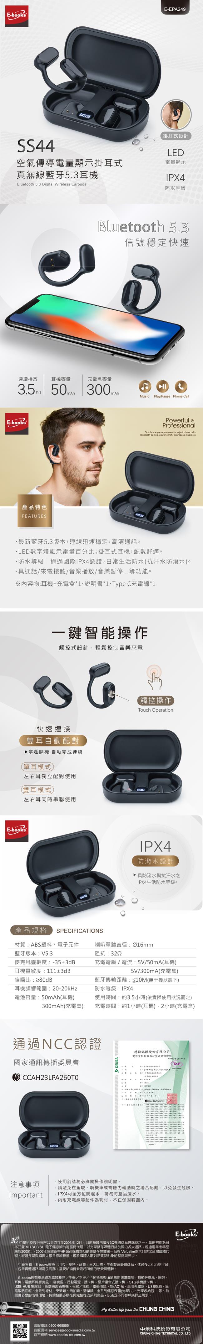 E-books品牌理念,以「用心、堅持、品質」三大經營主軸,秉持高品質的設計概念、並以實惠價格行銷策略,希冀帶給國人平價而超值的商品體驗,符合M型化社會新奢華商品的商品設計潮流,歷時兩年完整的商品行銷與策略規劃,於2008年推出3C週邊系列商品,到目前為止,已超過7000個以上銷售通路據點販售E-books品牌系列商品,並同步行銷於各大電子商務平台,經多年市場粹練,深受消費者喜愛與肯定,建立起品牌與技術兼容最佳品牌的專業形象。