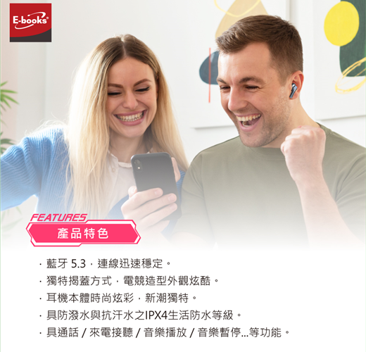 E-books品牌理念,以「用心、堅持、品質」三大經營主軸,秉持高品質的設計概念、並以實惠價格行銷策略,希冀帶給國人平價而超值的商品體驗,符合M型化社會新奢華商品的商品設計潮流,歷時兩年完整的商品行銷與策略規劃,於2008年推出3C週邊系列商品,到目前為止,已超過7000個以上銷售通路據點販售E-books品牌系列商品,並同步行銷於各大電子商務平台,經多年市場粹練,深受消費者喜愛與肯定,建立起品牌與技術兼容最佳品牌的專業形象。