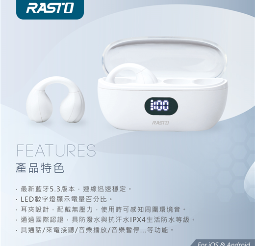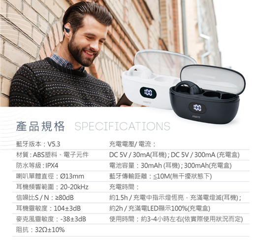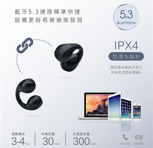 .L耳夾設計,配戴無壓力,使用時可感知周圍環境音