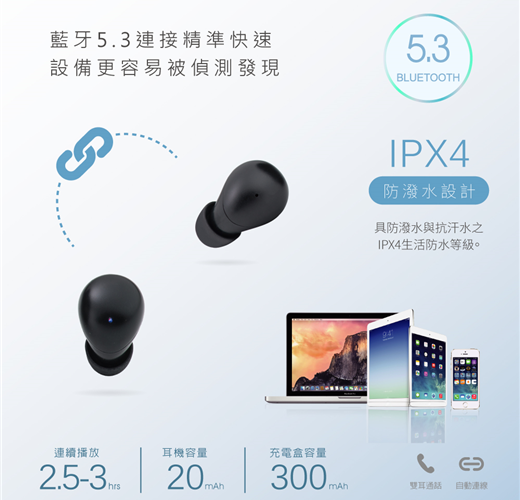 .電池容量:20mAh(耳機);300mAh(充電盒)