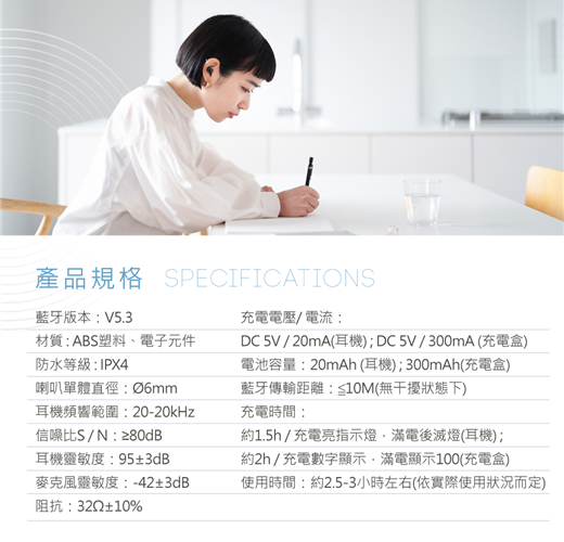 .充電電壓/電流: DC 5V/20mA(耳機); DC 5V/300mA(充電盒)