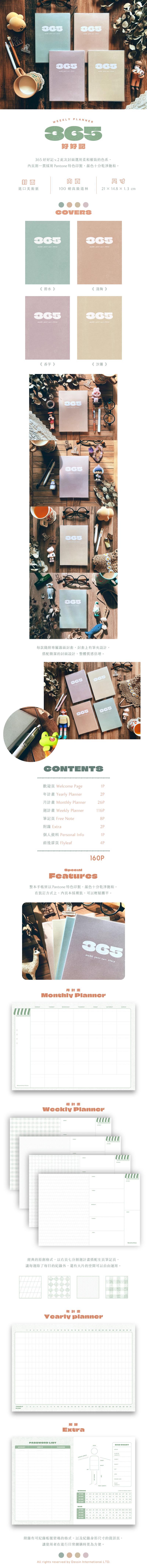 整本手帳皆以Pantone特色印製,顏色十分乾淨飽和。在裝訂方式上,內頁本採裸裝,可以輕鬆攤平,每款隨附專屬霧面封套,封套上有筆夾設計,搭配簡潔的封面設計,整體質感倍增。附錄有可紀錄帳號密碼的格式,以及紀錄身形尺寸的資訊頁,讓使用者在進行日常網購時更為方便。