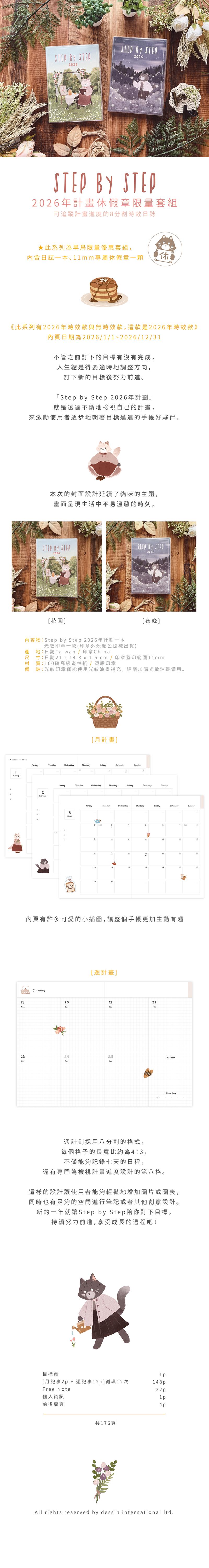 不管之前訂下的目標有沒有完成,人生總是得要適時地調整方向,訂下新的目標後努力前進。「Step by Step 一年計劃v.8」就是透過不斷地檢視自己的計畫,來激勵使用者逐步地朝著目標邁進的手帳好夥伴。