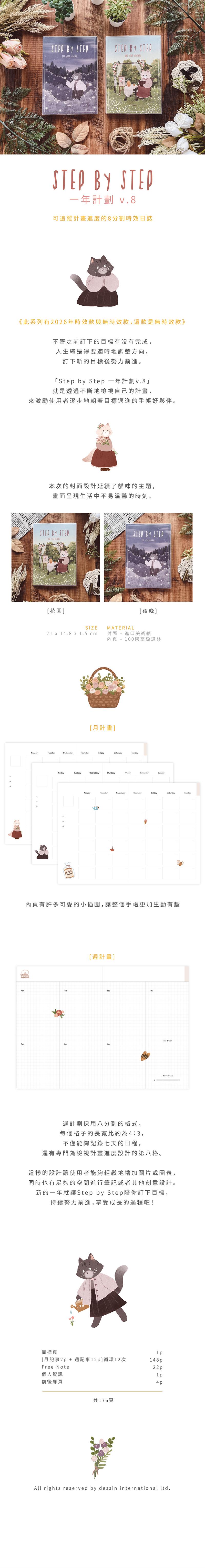 不管之前訂下的目標有沒有完成,人生總是得要適時地調整方向,訂下新的目標後努力前進。「Step by Step 一年計劃v.8」就是透過不斷地檢視自己的計畫,來激勵使用者逐步地朝著目標邁進的手帳好夥伴。