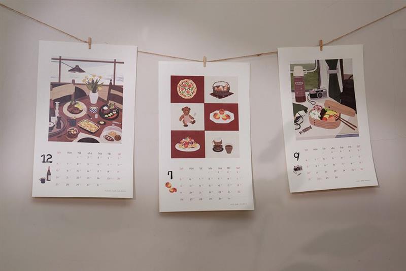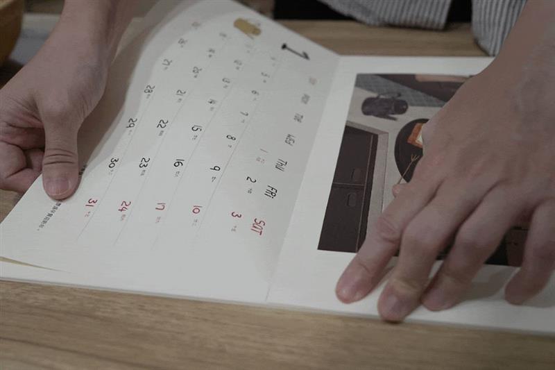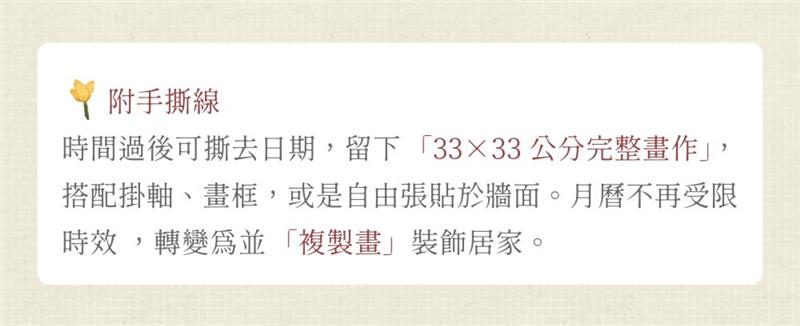 時間過後可撕去日期,留下「33×33 公分完整畫作」,搭配掛軸、畫框,或是自由張貼於牆面。月曆不再受限時效 ,轉變為「複製畫」裝飾居家。