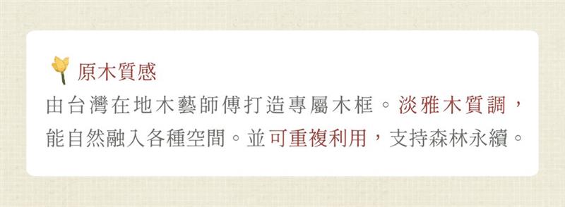 由台灣在地木藝師傅打造專屬木框。淡雅木質調,能自然融入各種空間。並可重複利用,支持森林永續。