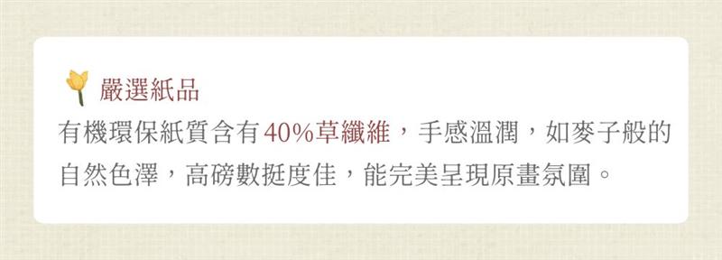 有機環保紙質含40%草纖維,手感溫潤,如麥子般的自然色澤,高磅數挺度佳,能完美呈現原畫氛圍。