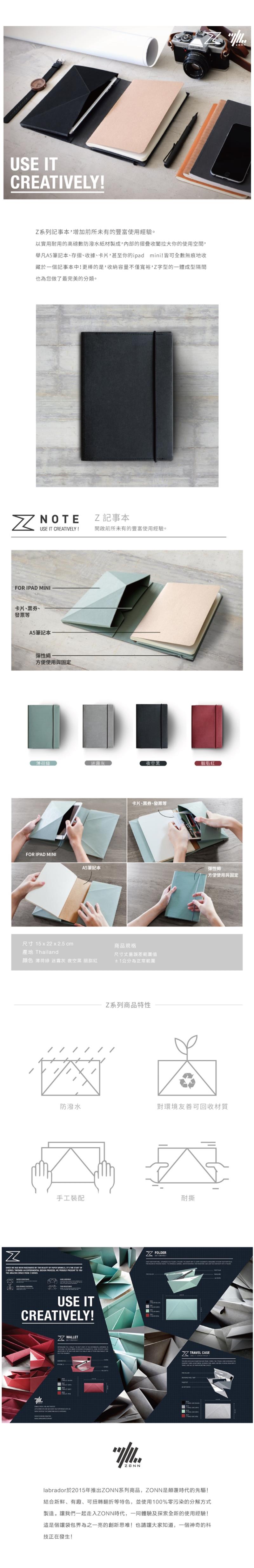 以實用耐用的高磅數防潑水紙材製成,內部的摺疊收闔拉大你的使用空間,舉凡A5筆記本、存摺、收據、卡片,甚至你的ipad mini!皆可全數無痕地收藏於一個記事本中!更棒的是,收納容量不僅寬裕,Z字型的一體成型隔間也為您做了最完美的分類。