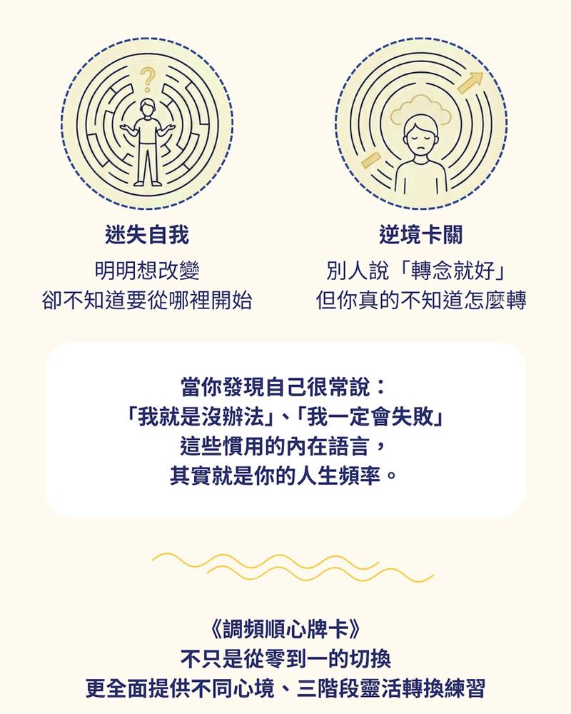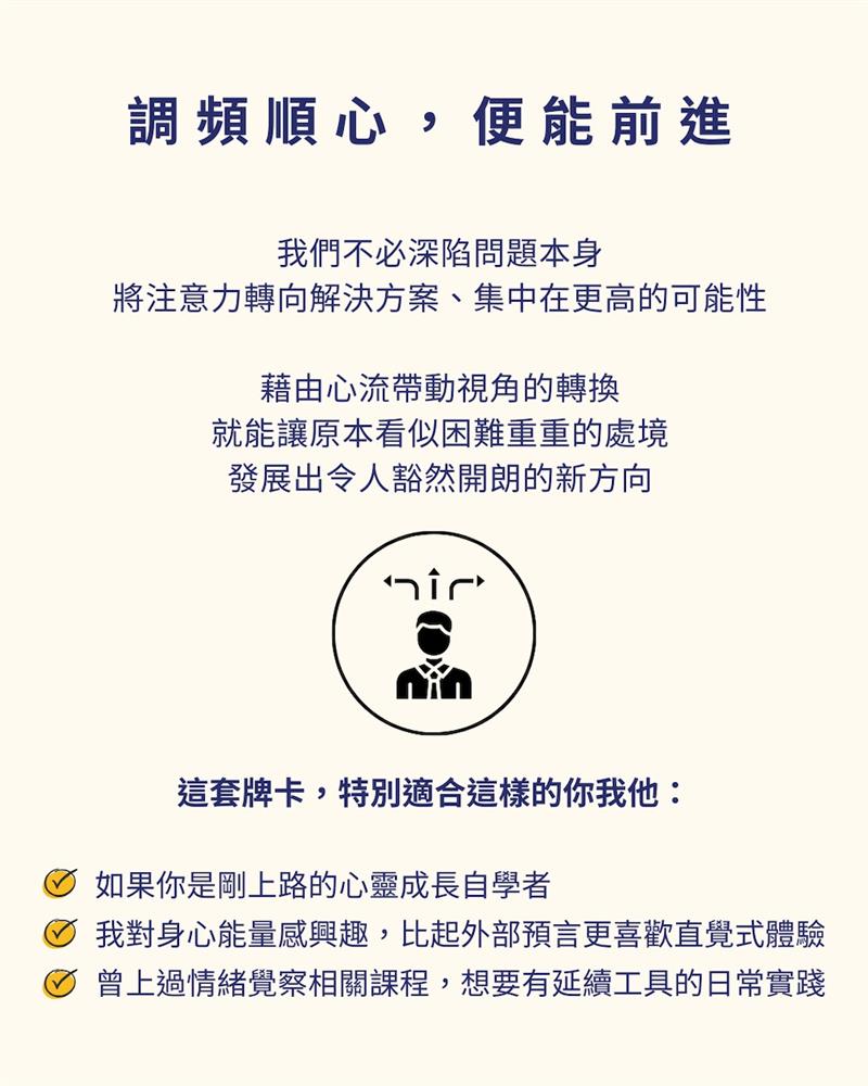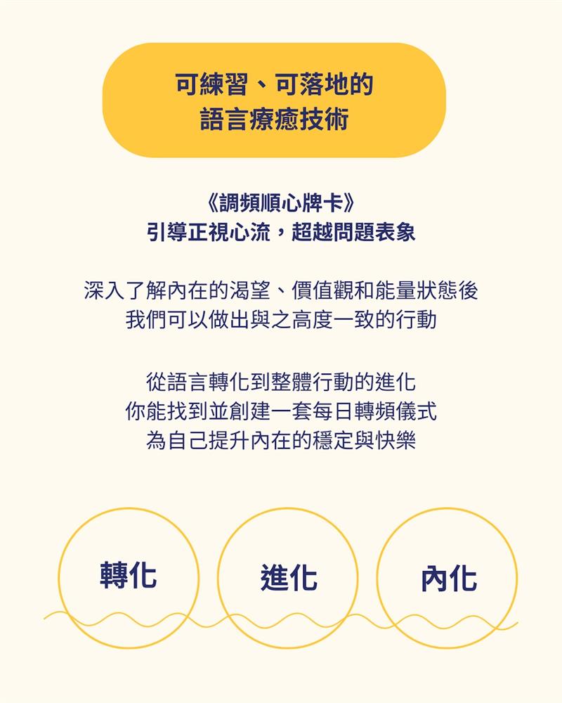 日常實用的心靈成長工具,更是藝術典藏作品!結合教練思維、語言調頻與能量頻率學說,陪你調整思路、開拓心境,在對頻的狀態下,所有選擇將一目瞭然。