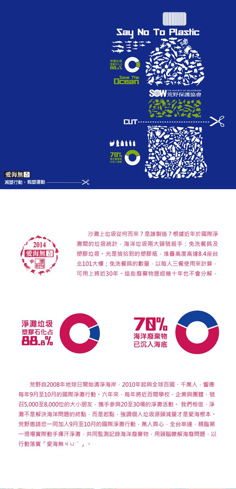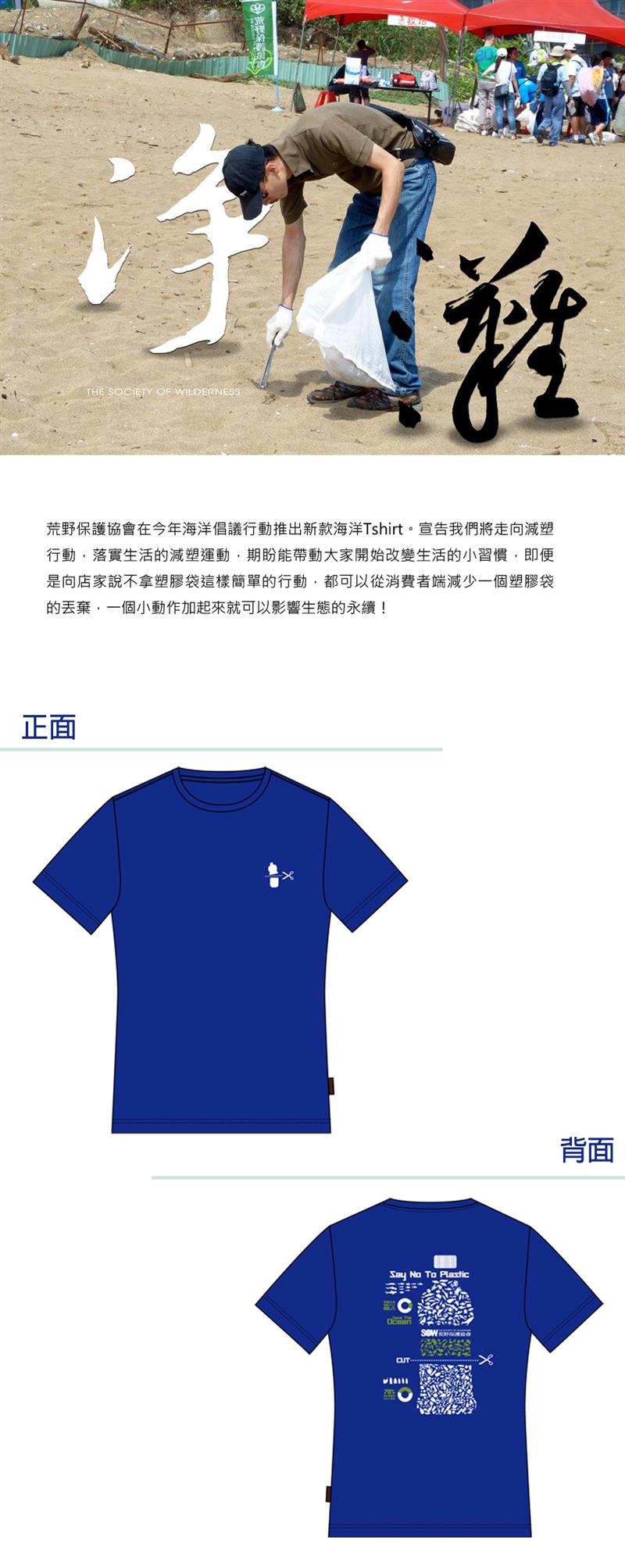 荒野自2008年地球日開始清淨海岸,2010年起與全球百國、千萬人,響應每年9月至10月的國際淨灘行動。六年來,每年將近百間學校、企業與團體,號召5,000至8,000位的大小朋友,攜手參與20至30場的淨灘活動。 我們相信,淨灘不是解決海洋問題的終點,而是起點,強調個人垃圾源頭減量才是愛海根本。荒野邀請您一同加入9月至10月的國際淨灘行動,萬人齊心,全台串連,親臨第一現場實際動手揮汗淨灘,共同監測記錄海洋廢棄物,用頭腦瞭解海廢問題,以行動落實「愛海無ㄐㄩˋ」。荒野保護協會在今年海洋倡議行動推出新款海洋Tshirt。宣告我們將走向減塑行動,落實生活的減塑運動,期盼能帶動大家開始改變生活的小習慣,即便是向店家說不拿塑膠袋這樣簡單的行動,都可以從消費者端減少一個塑膠袋的丟棄,一個小動作加起來就可以影響生態的永續!