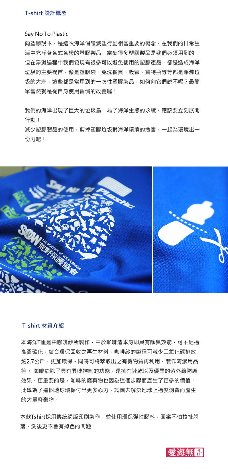 本海洋T恤是由咖啡紗所製作,由於咖啡渣本身即具有除臭效能,可不經過高溫碳化,結合環保回收之再生材料,咖啡紗的製程可減少二氧化碳排放約2.7公斤,更加環保。同時可將萃取出之有機物質再利用,製作清潔用品等。 咖啡紗除了具有異味控制的功能,還擁有速乾以及優異的紫外線防護效果。更重要的是,咖啡的廢棄物也因為這個步驟而產生了更多的價值。此舉為了這個地球環保付出更多心力,試圖去解決地球上過度消費而產生的大量廢棄物。