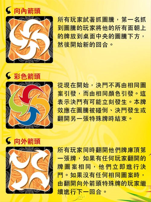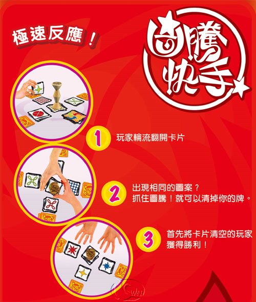 將牌發給每個玩家,為了要獲勝,你必須是第一個將手中的牌出完的玩家。每一回合,所有玩家翻出自己的一張牌,若有二張牌是相同的,那二個玩家就必須去抓取圖騰,較快的玩家則將他的牌給那倒霉的對手。