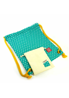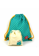 將束口後背包 3x3 井字三折收納,即可放入小收納袋中。每個小收納袋都有與束口後背包相同的花色在袋前,也可當親子收納、情侶收納包。