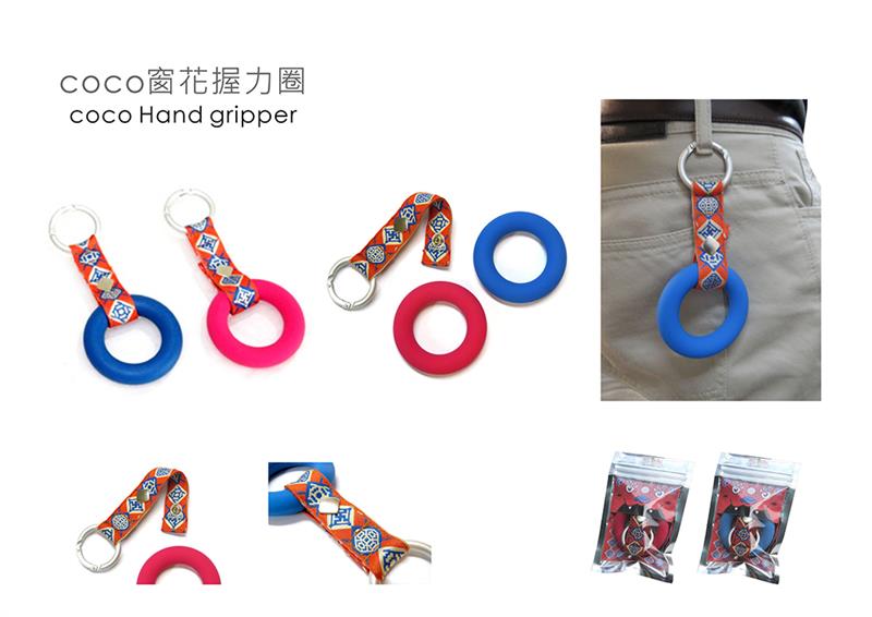 搭配府城濃厚意象的古蹟窗花織帶,傳承了台南傳統文化的特色,包裝上的獅子門環象徵傳統官邸門上扣環,敲著拜訪台南充滿文化特色的生活氛圍「coco窗花」握力圈,具方便攜帶的舒壓小物,更顯文化特色。