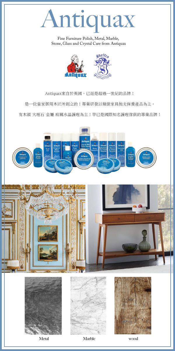 Antiquax來自英國,已經是超過一世紀的品牌!由一位皇家御用木匠所創立,專業研發以精緻家具拋光保養產品為主。有木頭、大理石、金屬、玻璃水晶護理為主,享譽國際的家具護理專業品牌。更是喜愛手作DIY達人不可或缺的基礎工具。
