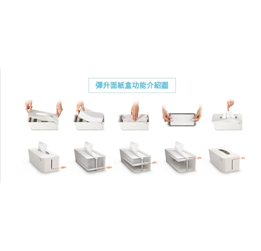 注意事項:適用市面上多數廠牌面紙,如購買盒裝面紙,欲使用特殊彈簧功能,需先將紙盒拆除。