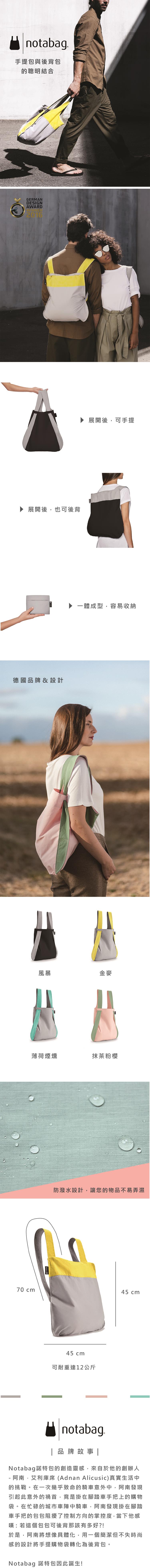 Notabag 巧妙的結合提袋與後背包之優點。 以環保取向,提供活躍忙碌的現代人更簡便的生活方式。 創造 Notabag 諾特包的靈感來自現實生活的挑戰。