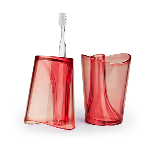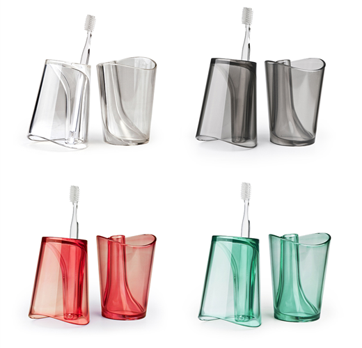 漱口杯,翻個身,就是牙刷架,杯緣獨特的圓弧設計,讓杯子在翻轉過來的時候,還可以保留通風的空隙,解決一般漱口杯排水不良,容易發霉的問題。而杯子一轉,又可節省空間放置牙刷。時尚流線的造型,增添居家的品味。