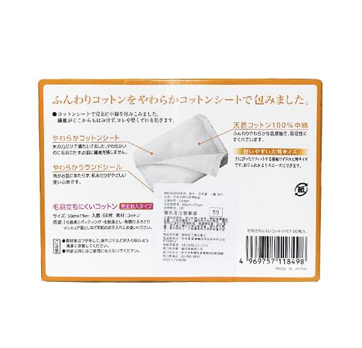 肌膚如感異常,請立即停止使用。開封後請蓋妥盒蓋,以免灰塵進入。請勿用於其他用途。請勿使用/保管於日照直射處、高溫潮濕處、近火源處。請保管於嬰幼兒無法取得處。請勿丟入馬通。素材特性上,可能會有棉花果皮或種子混入。
