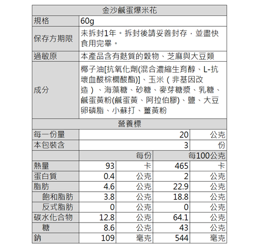 ◎品名:金沙鹹蛋爆米花(蛋奶素)