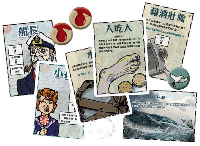 一輪結束時會翻開航海牌, 看誰會落海和/或口渴;如果航海牌上出現海鷗,代表 你們越來越靠近陸地。