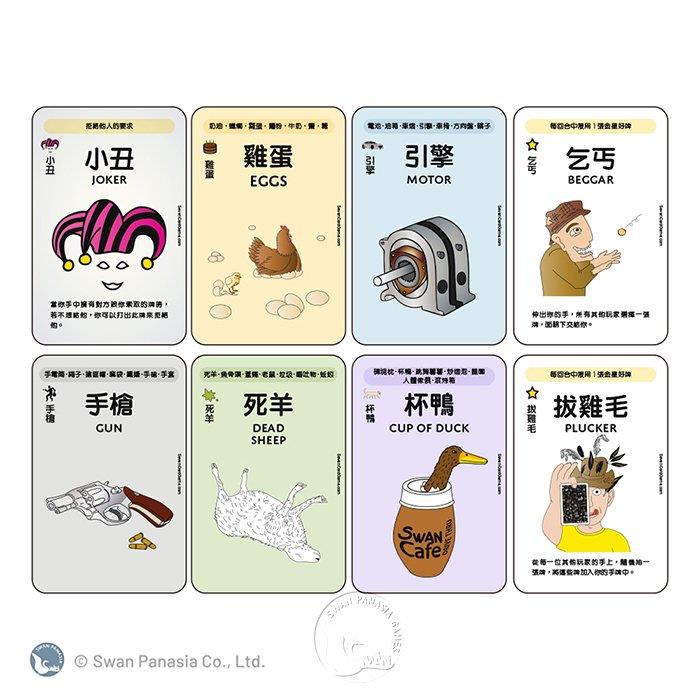 除了七組不同類別的紙牌外,還有4張小丑牌、14張金星好牌和3張黑星壞牌,