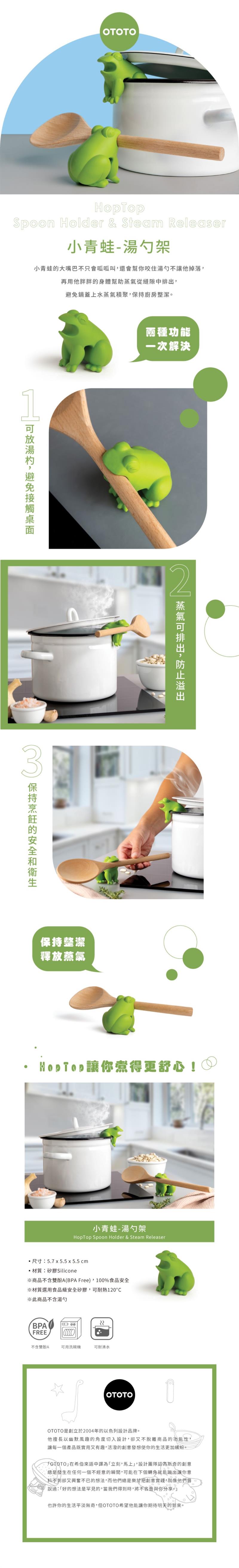 小青蛙的大嘴巴不只會呱呱叫,還會幫你咬住湯勺不讓他掉落,再用他胖胖的身體幫助蒸氣從縫隙中排出,避免鍋蓋上水蒸氣積聚,保持廚房整潔。
