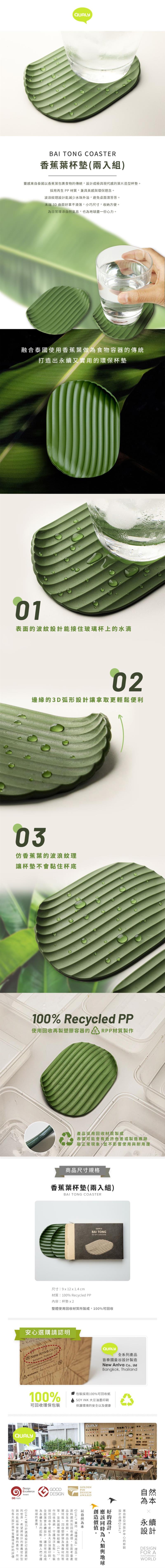 "靈感來自泰國以香蕉葉包裹食物的傳統,設計成極具現代感的葉片造型杯墊。採用再生 PP 材質,兼具美感與環保理念。