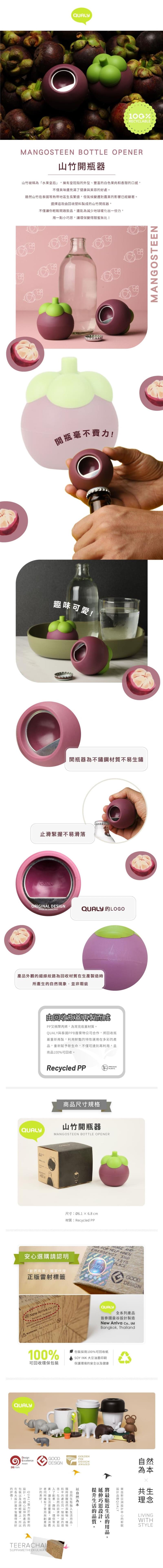 別擔心,我們有解決方案!選擇這款由回收塑料製成的山竹開瓶器,不僅能讓你輕鬆開啟飲品,還能為減少全球暖化出一份力。你在享受美味的同時,也能為保護我們的農作物貢獻一份力量。用一點小巧思,讓環保變得甜蜜無比!