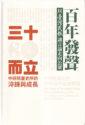 主辦「百年發聲×三十而立 : 中研院臺史所設所30年紀念特展」的展覽圖錄,收錄精選的日記、報紙、舊籍、手稿與照片檔案,回顧百年前的1920年代,臺灣人如何透過發行 ...