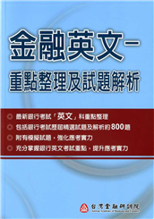 「金融英文—重點整理及試題解析」乙書為銀行考試參考用書,係針對銀行考試普通科目之「英文」乙科所編寫,全書共分為六章,除了英文內容的重點整理外,尚有歷屆英文考題及其解析與模擬試題,完整呈現銀行考試所需具 ...