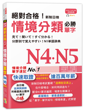 以情境分類,單字速記NO1!新制日檢考試重視「活用在交流上」在什麼場合,如何用詞造句?本書配合N4,N5要求,場景包羅廣泛,這個場合,都是這麼說,從「單字→單字成句→情境串連」式學習,打好「聽說讀寫」 ...