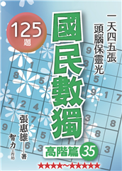 數獨雖然只是一種填寫數字的遊戲,它不但是娛樂的,也是益智的,它更能訓諌一個人的邏輯概念更能增進個人的歸納規則,本書全數以12X12呈現,比一般數獨更加困難。. ...