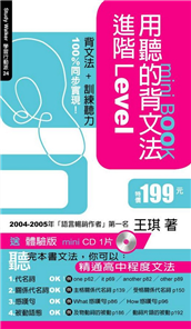 Level》收錄英檢中級、高中程度的常用文法,並延續《用聽的背文法基礎Level》著重於聽力學習的方法。CD收錄「文法解說」、「應用公式」以及「例句練習」。打破背文法一定要看書的傳統 ...