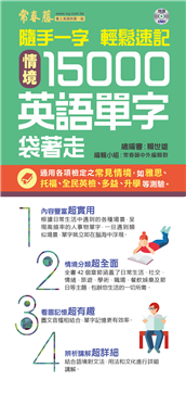 囊括所有情境!生活與考試必備的《情境 15000 英語單字袋著走》,翻轉您的人生!本書主題涵蓋生活會遇到的各種情境,熟讀本書即可掌握 15,000 到 20,000 個字彙以及其用法,讓您面對生活情境 ...