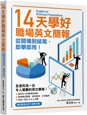 專為工作忙碌,有立即簡報需求的職場上班族所設計!台科大連開18年的秒殺英文簡報課!濃縮14天課程,收錄完整簡報必備金句,讓你快速做出一場英文流暢、抓住眼球的簡報!本書是台科大應外系超人氣教授