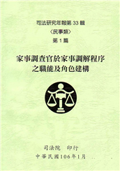 司法研究年報第33輯(民事類)第1篇「家事調查官於家事調查程序之職能及角色建構」、第2篇「違章建築之法律地位研究」、第3篇「民事保護令之實務研析」、第4篇「兒童權利公約於我國家事事件審理中之意義與實踐 ...