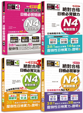 瞄準新日檢高分套書↓3個月紮實打底學習「日檢N4爆銷熱賣套書」,N4合格絕對綽綽有餘↓單字:重音‧單字‧文法交叉高效訓練,例句內容緊跟新日檢腳步,貼近日本生活! 文法:關鍵字+首創30分鐘,文法速記表 ...