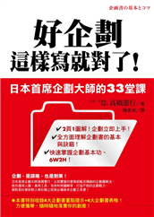 對於想要撰寫企劃書的商業人士來說,本書可說是一本架構完整、參考性高的工具書。全書分為基本篇與訣竅篇,以33項主題構成。看完之後很快地就能上手,透過實地演練,人人皆可成為企劃書的高手。作者非常強調的企劃 ...