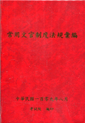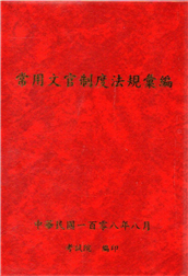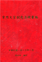 本彙編所載法規,以經過立法程序之法律及考試院發布、經考試院核備或與考試院職掌有關之各種考銓保訓退撫基金規章為限。內容首列「憲法及相關法規」,次錄文官制度法規二百餘種,並依性質分別編為「組織」、「官規」 ...