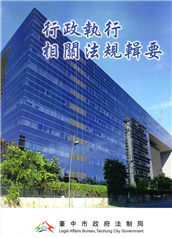 整理行政執行法、行政程序暨臺中市政府行政執行相關法規,提供市政府各機關承辦行政執行業務人員參考,編撰「行政執行相關法規輯要」一書,收錄較具經常性與實用性之法規,俾供承辦同仁參閱、利用。. ...