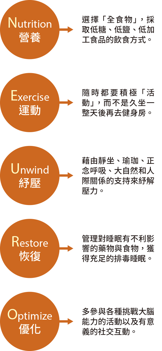 我們的大腦是一個活生生的宇宙,受到營養、運動、壓力、睡眠以及參與認知活動的程度所影響。換言之,你餵它吃什麼,你如何對待它、訓練它,以及你讓它休息的方式,都會直接影響到我們的大腦,而如何調整這5種生活型態因素,正是這項空前計畫的關鍵。