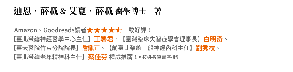 阿茲海默症症狀一旦顯現就無法治癒,但你可以多做一點改善認知的活動,逆轉衰弱症狀,為你自己多增加幾年快樂健康的生活。即使你已被確診阿茲海默症。生活型態非常重要,它是我們的防護措施,而且它比你想像的更容易。我們認為,身為醫生的我們有責任分享我們所學的東西,我們希望你用這本書來轉化你的生命,並協助扭轉阿茲海默症的狂潮。