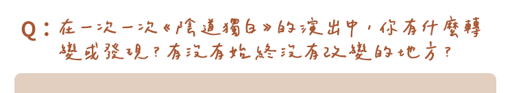 A:最大的改變就是發現過去那些以為理所當然的事,其實只是表面的假像。 必須承認在最一開始,我其實對女性議題沒有太強烈的興趣,因緣際會製作了《陰道獨白》的讀劇單純是覺得劇本有趣,想累積演出作品,並沒有抱著倡議或太偉大的目標。我一直都自認為我的家庭教育和成長環境相當開明,我從來沒有因為性別而受到限制。所以我甚至一度相信,此刻的台灣社會已經足夠性別平等了,可以不用再過度的強調女性議題了(顯示為天真)。 然而在一次演員們互相分享被性擾擾的經驗時,我才在重述的過程中驚覺:當下的恐懼和羞愧的感受居然在20年後不曾消退,它只是被掩埋在更深的角落裡,當作遺忘。過於震驚的我不得不重新思索,當時我明明受到極大的驚嚇為甚麼不敢對任何人說?為何身為女性,被侵犯時卻會感覺『 羞愧 』?這些難以覺察的、幽微的奇怪價值觀究竟是何時纏繞在我身上,卻又讓我毫無所覺? 這樣的發現像是開啟了開關,突然生活中的一切不再那麼理所當然。我開始可以嗅聞到藏匿在日常生活裡無所不在的各種性別偏見與不公平,不論是對男性或女性都所在多有。更可怕的是,有時甚至自己也會在無意識中參與成為共犯。原先那些我以為無關緊要的事,原來時時刻刻都影響著我對自己身為女性的認知。 《陰道獨白》一次次的演出是一記記的探究。它慢慢敲裂了的假面,讓我從縫隙中看見性別議題當中仍存在許多部分值得深掘。這是一條可以永遠更成熟而沒有終點的漫漫長路。 始終沒有改變的地方是《陰道獨白》不斷被觀眾鼓勵著。在空間不大的親密演出場域裡,文本、表演、音樂與觀眾時刻互相流動,彼此感受。每一場演出我們與觀眾共享的時刻,所有人因故事的情感共鳴連結在一起。這樣的能量讓我們相信《陰道獨白》存在的意義,推動著劇組持續走下去。 |