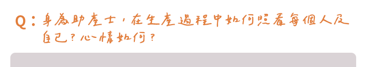 A:在協助產家生產的過程中,我往往做最多的事是「觀察」。觀察環境的設置,觀察產程運作中產婦的反應,觀察所有參與者的情緒以及生理需求,然後做適當的調配,當然也包括自己。 雖然我們常說「生產是很自然的事」,但對於產家而言,這件事他們會經歷的次數,大多五根手指頭數得出來;助產師的工作,便是協助產家揉合日常、生產與醫療科技,在穩定且知曉一切的情況下,完成這件自然的事。 協助產家生產的過程中,助產人員其實是隨時處在專注狀態評估一切的,直到產後觀察確認產家一切穩定,才能夠稍微放下心來,迎接隨之而來的產後哺育指導與訪視工作。每每看著、陪伴著新生家庭的成立,都讓我深深感受到生命力量的強大。一個生命能夠經歷如此翻攪的過程來到這個世界,一個家庭能夠因為新生命的誕生,而開啟不同的視野與歷練,是世界上最大的奇蹟;自然,卻又如此神奇。 也許有時候,產家生產的過程與方式和原本預期的有所差異,會失落、會難過,我們依然陪伴著。我總相信一切經歷的,都是在為將來鋪路;是覺察的契機,也是力量崛起的跳板。 |