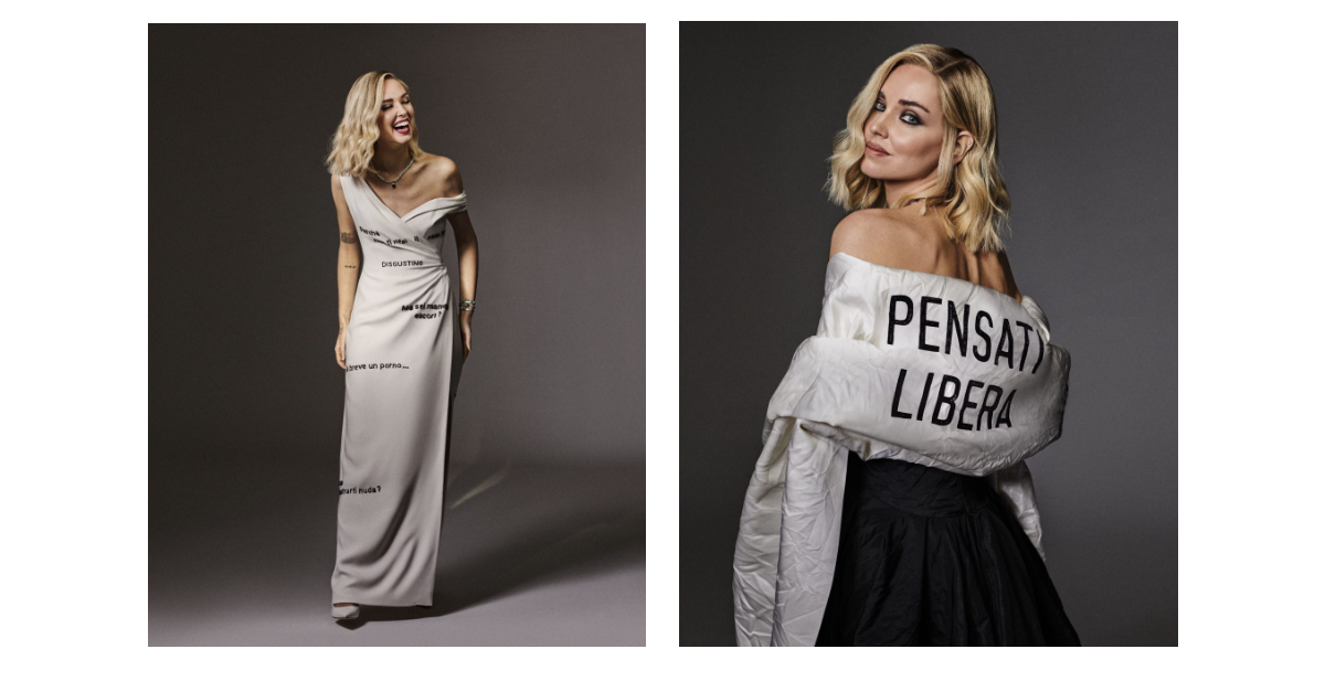 今年二月,義大利相當有代表性的Sanremo音樂節邀請到時尚KOL Chiara Ferragni出席,當天她身穿Dior為她訂製的4套服裝,分別以裸體身軀圖樣、標語披肩、透視蓬裙、負面留言印花作為每一套的主題,彰顯女性身體自主權當下面臨的種種問題。她在活動上發表演說:「我們無法在自己的身體裡自由生活,穿太多會被說是修女,穿太少會被說是妓女。」更以一個媽媽的身份對年輕的自己和所有女性說:「不要害怕做你自己的後果,請不受限制地做女人吧!告訴你自己,告訴你的朋友,並向全世界大聲疾呼,這樣事情就會有所改變。」