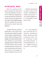 首先,教授詳細闡述越來越多公立學校的學生開始上中文課的原因;他將其歸因於預算縮減,導致學校無法提供像以往那麼多的外文課程。同時間,許多學校接納了由中國政府部分資助的普通話老師,目的是舒緩預算刪減的壓力。相反地,閱讀篇章只單純描述普通話課程在許多州都持續增加。