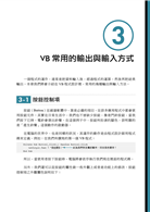 *詳盡地介紹Visual Basic程式設計的重要觀念與技巧,包括:VB的運算、判斷流程控制、迴圈流程控制、陣列、搜尋、排序、VB函式應用、檔案操作…等重要主題。