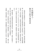 本書給出了直白提醒與具體建言,引領你我理解,必須及早覺醒以儲備一些才情與重要能力,才能營造出自己喜歡、他人也尊敬且推崇的優雅老年生活方式。那就要從四十歲進入熟齡開始。因為台灣人平均壽命幾近八十歲,四十歲正是邁入熟齡人生的分水嶺,從這年紀開始思考、規畫、儲備老年應具備哪些能力、心態與生活行動準則,正是本書提醒的重要事項。從自覺開始,儲備老年的自立與自律力,自己動手不勞煩他人、勞動工作到最後一口氣;持續成長、保持風趣的人際互動力;懂得自得其樂取悅自己的「獨處自愛美學」;自在面對生死和宇宙神奇力量的彈性視力等。